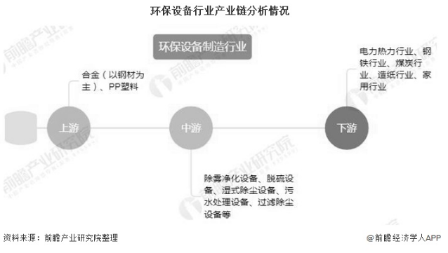 中國環(huán)保產(chǎn)業(yè)鏈的結(jié)構(gòu),主要包括上游市場即工業(yè)“三廢”的排放,以及在生活中產(chǎn)生的廢品,廢水等。環(huán)保設(shè)備制造是中國環(huán)保產(chǎn)業(yè)鏈中的重要組成部分,其上游主要是生產(chǎn)設(shè)備所需的鋼材、有色金屬、PP塑料等原材料,下游主要包括電力熱力行業(yè)、鋼鐵、煤炭行業(yè)、造紙行業(yè)等。