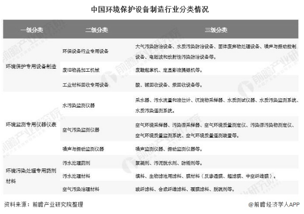 中國環(huán)境保護設(shè)備制造行業(yè)可以分為3類,即環(huán)境保護專用設(shè)備制造、環(huán)境監(jiān)測專用儀器儀表、環(huán)境污染處理專用藥劑材料。